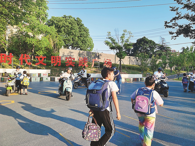 南京市棲霞區(qū)實驗小學西門前的口袋公園廣場上,孩子們歡笑著跑向父母。 劉玉琴 攝