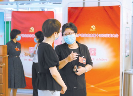 分團(tuán)討論休息時(shí),教育系統(tǒng)的代表在會(huì)議室外繼續(xù)交流。本報(bào)記者 賈同軍攝