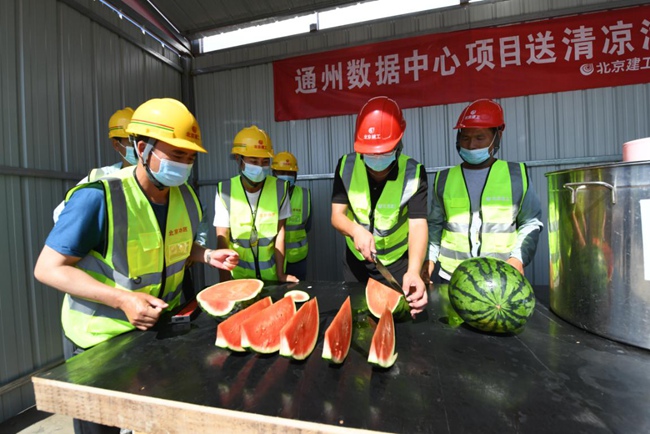 在通州數(shù)據(jù)中心項目頂板鋪設施工現(xiàn)場,高溫對奮戰(zhàn)在施工一線的員工來說無疑是一場巨大的“烤驗”。“雖然現(xiàn)場的溫度達到了38℃,但是項目部合理調(diào)配時間,對現(xiàn)場的防暑降溫工作做了全面部署,施工現(xiàn)場配備了西瓜、綠豆湯、藿香正氣水和清涼油等防暑物資,在場邊設置了遮陽涼棚,并且讓施工人員避開上10點到下午3點的高溫期錯時上崗,保證現(xiàn)場安全生產(chǎn)的同時也盡量不耽誤項目進度?!表椖坎控撠熑撕乐艺f。