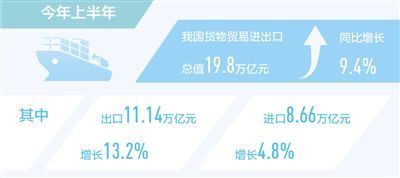 本報北京7月13日電?。ㄓ浾叨藕?jù)海關統(tǒng)計,今年上半年我國貨物貿易進出口總值19.8萬億元,同比增長9.4%。其中,出口11.14萬億元,增長13.2%;進口8.66萬億元,增長4.8%。