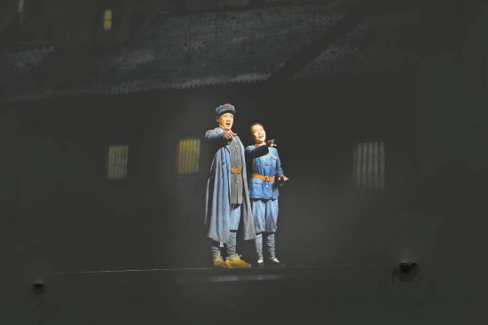 “閻老師可以再往前走幾步,要不然后面的合唱團一上來有點擠。”舞臺監(jiān)督陳歡用激光筆指了一下舞臺的前側區(qū)域。歌唱家閻維文點點頭,對臺下比了“OK”的手勢。燈光再次到位,排練繼續(xù),多媒體影像配合著兩側峭壁般聳立的舞美裝置,讓湘江翻涌的江水和咆哮的戰(zhàn)火穿越歷史,滾滾而來。