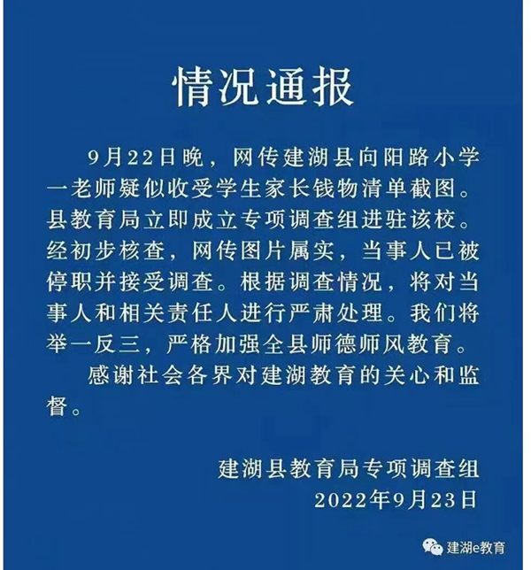 網(wǎng)傳鹽城建湖一老師收受學生家長錢物 官方回應:當事人已被停職