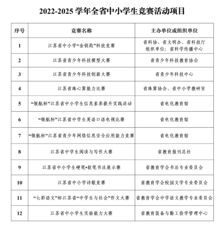 江蘇公布2022-2025學(xué)年中小學(xué)生競賽活動項(xiàng)目