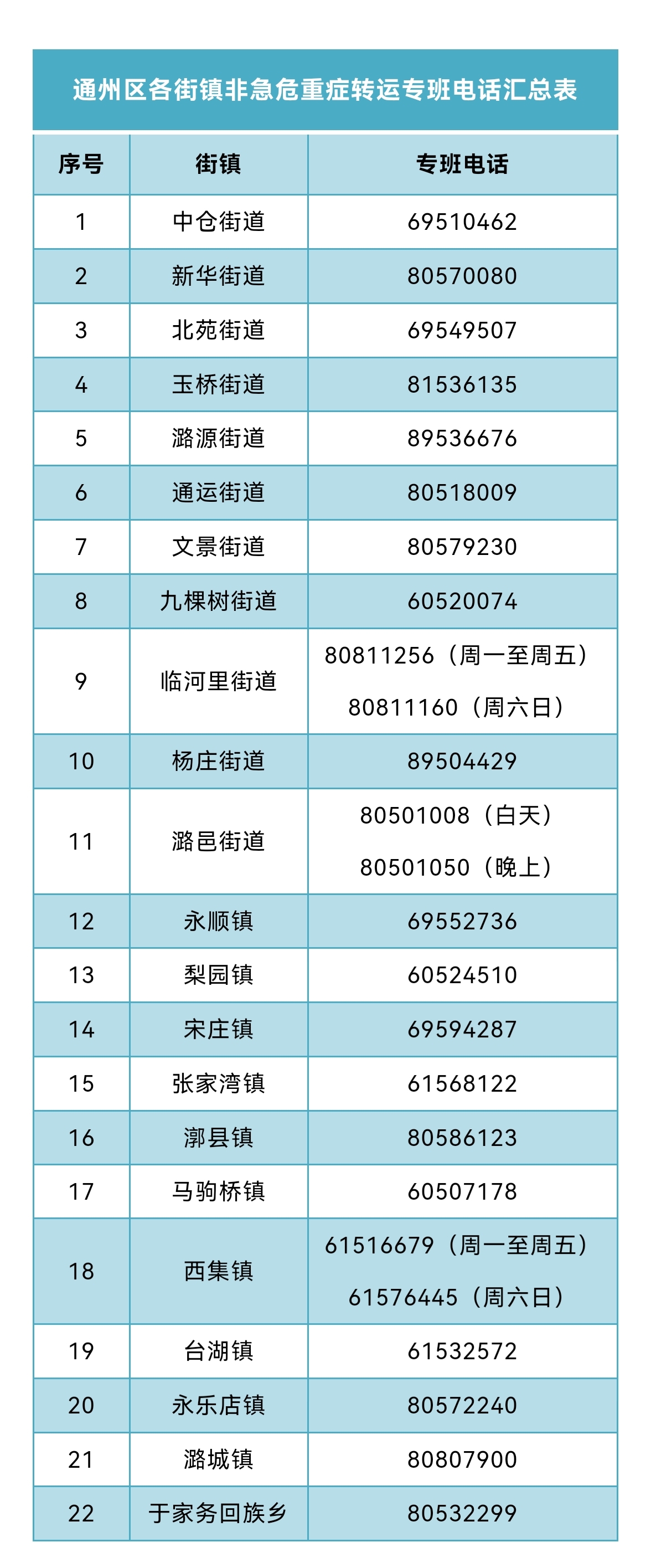 人民網(wǎng)北京12月21日電 為進(jìn)一步保障非急危重癥群眾就醫(yī)需求,不擠占120醫(yī)療急救資源,暢通就醫(yī)出行通道,將120救護(hù)車(chē)留給急危重癥患者,北京市通州區(qū)向社會(huì)公布各街道鄉(xiāng)鎮(zhèn)非急危重癥轉(zhuǎn)運(yùn)專(zhuān)班熱線(xiàn)電話(huà)(具體熱線(xiàn)電話(huà)見(jiàn)下表)。