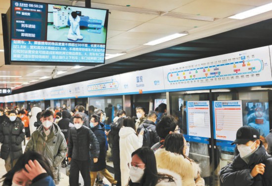 昨天,在國貿(mào)站,乘客逐漸增多,北京地鐵已縮短發(fā)車間隔。本報記者 鄧偉攝