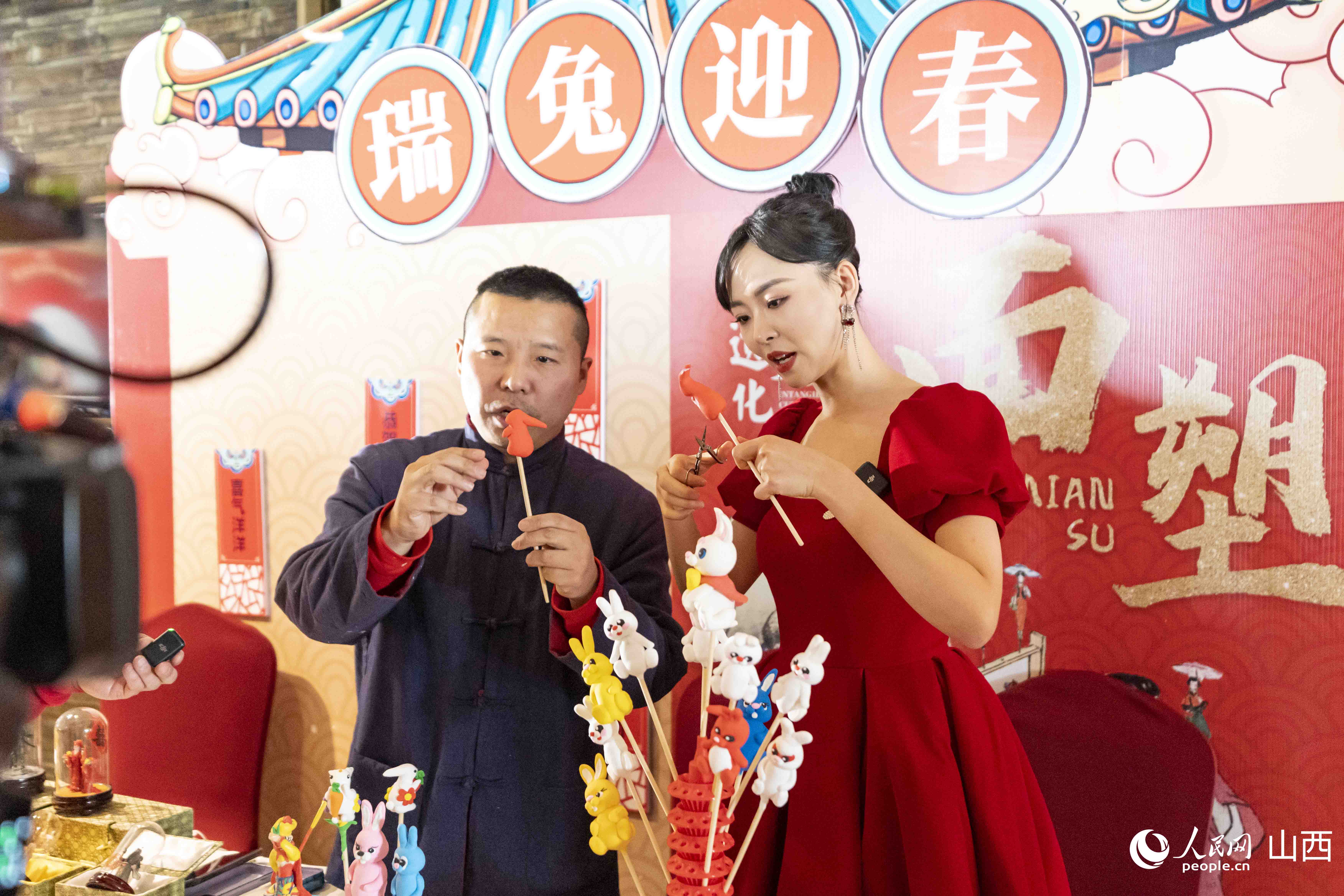 在推介活動現(xiàn)場,精心布置了“新春市集”互動體驗區(qū)、年俗非遺互動體驗區(qū)、年俗節(jié)目快閃區(qū)等頗具山西特色文化的體驗區(qū)域,營造了喜慶、熱烈的春節(jié)氛圍。剪紙、木板年畫、糖畫、面塑等項目,讓現(xiàn)場嘉賓沉浸式體驗山西非遺的獨特魅力。在山西年俗表演快閃區(qū)域,舞獅表演、旱船等山西社火表演,讓濃濃的年味迎面撲來。活動中,飽含山西大院文化符號、中國結(jié)等元素,寓意團圓美滿的山西文旅兔年IP形象“晉小美”也首次亮相。