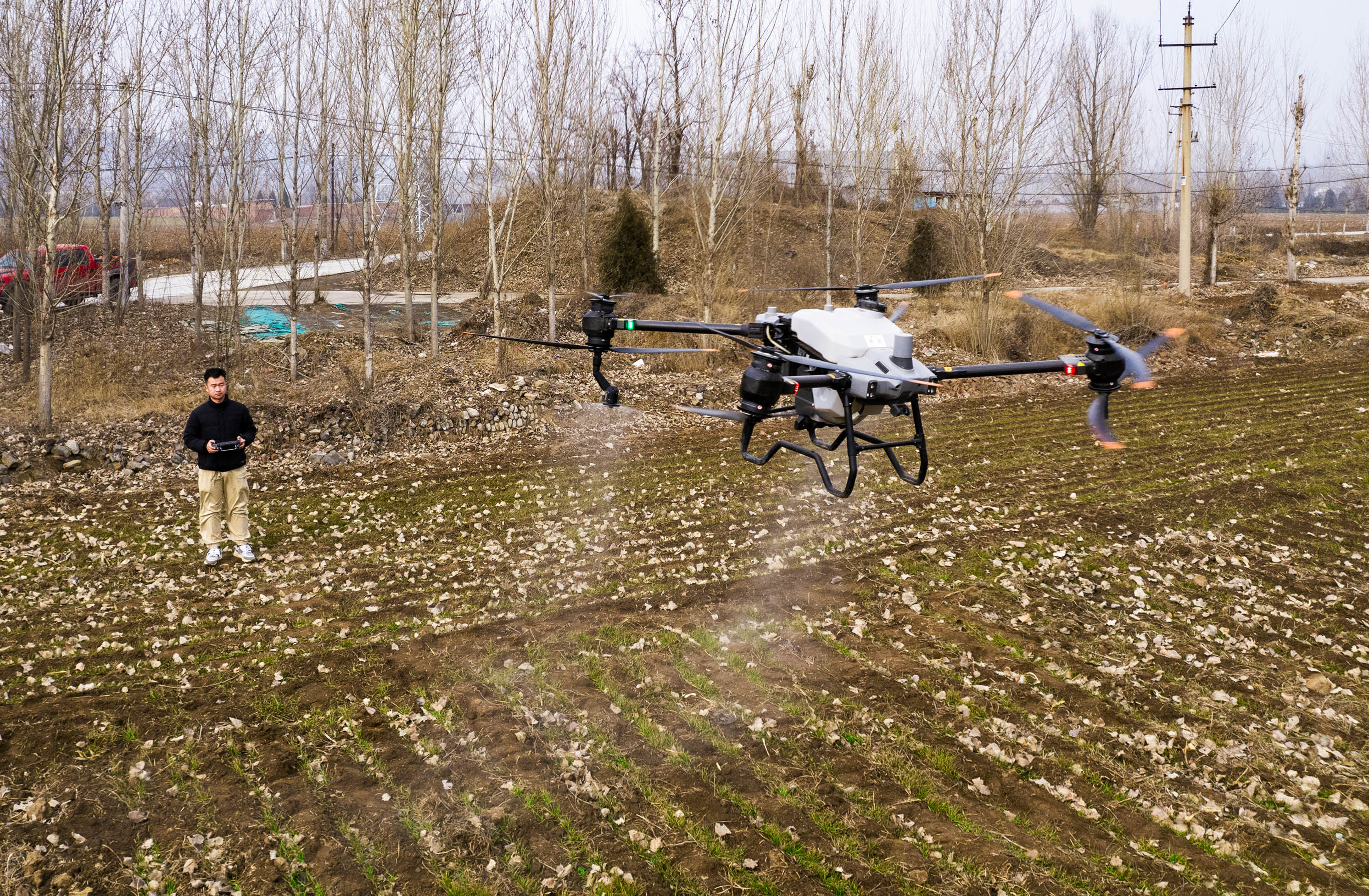 2月15日,在晉城市城區(qū)南村鎮(zhèn),操作員正熟練地遙控農(nóng)業(yè)專用無(wú)人機(jī)給麥田播撒肥料,大大提高了工作效率。