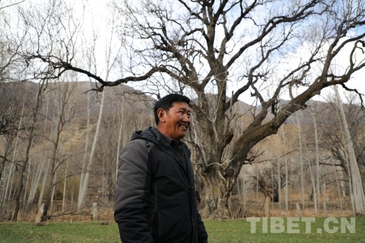 圖為熱果村黨支部書記達娃與身后的“糌粑拉姆”核桃樹 攝影:呂靜