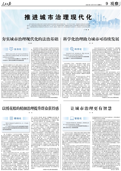 城市治理體系和治理能力現(xiàn)代化是國家治理體系和治理能力現(xiàn)代化的重要內(nèi)容。習(xí)近平總書記指出:“推進(jìn)國家治理體系和治理能力現(xiàn)代化,必須抓好城市治理體系和治理能力現(xiàn)代化。”總書記在上??疾鞎r(shí)強(qiáng)調(diào):“把增進(jìn)民生福祉作為城市建設(shè)和治理的出發(fā)點(diǎn)和落腳點(diǎn)”。本期觀察版圍繞如何提高城市治理法治化、科學(xué)化、精細(xì)化、智能化水平,更好推進(jìn)城市治理現(xiàn)代化、全面踐行人民城市理念進(jìn)行探討。