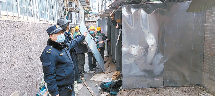 廣安門內(nèi)街道綜合執(zhí)法隊工作人員正在對私建鐵皮棚進(jìn)行拆除。