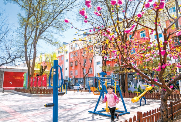 大興區(qū)興豐街道老小區(qū)黃村西里社區(qū)在居民的共同維護(hù)下,居住環(huán)境整潔舒適。圖為提升后的社區(qū)廣場上,小朋友正在樂享春光。本報記者 武亦彬攝