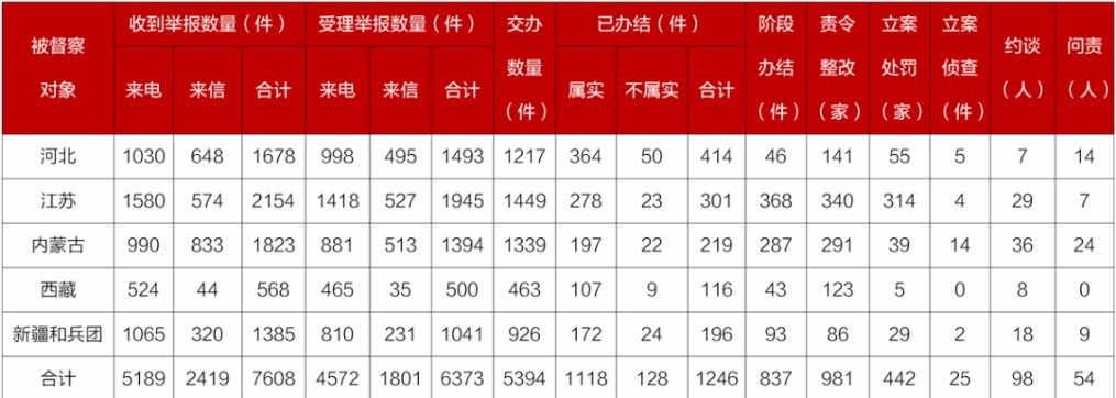 截至4月10日22時,各督察組共收到群眾來電、來信舉報7608件,受理有效舉報6373件,經(jīng)梳理合并重復(fù)舉報,累計向被督察對象轉(zhuǎn)辦5394件;被督察對象已辦結(jié)或階段辦結(jié)2083件,其中立案處罰442家;立案偵查25件;約談黨政領(lǐng)導(dǎo)干部98人,問責(zé)黨政領(lǐng)導(dǎo)干部54人。