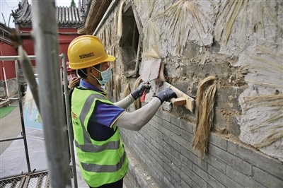 2021年9月16日,萬壽寺二期修繕工地,工人正在對墻體進(jìn)行修繕。新京報記者 鄭新洽 攝
