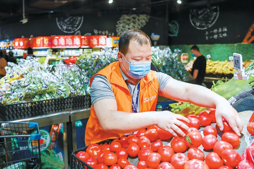 物美雙井店店長(zhǎng)宋飛飛在賣(mài)場(chǎng)查看蔬果銷(xiāo)售情況。本報(bào)記者 鄧偉攝