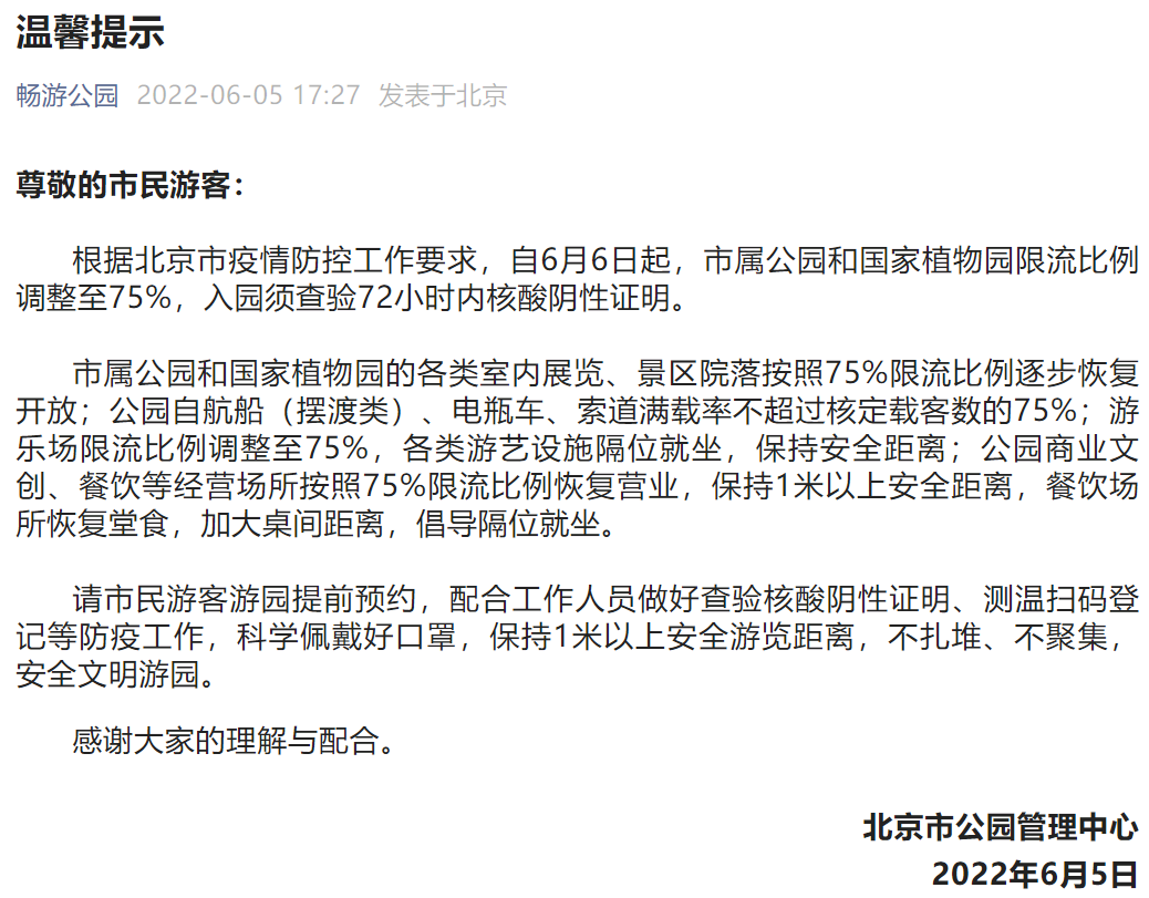 自6月6日起,北京市屬公園和國(guó)家植物園限流比例調(diào)整至75%