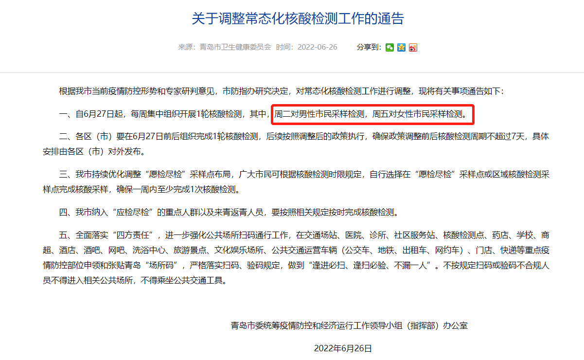 對(duì)此,青島市衛(wèi)健委回應(yīng):采用男女分開(kāi)檢測(cè),主要是借鑒大連等相關(guān)城市的經(jīng)驗(yàn)做法。依據(jù)奧密克戎毒株傳播特點(diǎn),將家庭和單位作為防控單元,男女分開(kāi)檢測(cè)相當(dāng)于每周對(duì)該防控單元進(jìn)行2次健康監(jiān)測(cè),在同等人力、物力投入下,在滿足7天一輪檢測(cè)的目標(biāo)的前提下,實(shí)現(xiàn)了篩查頻次的倍增,有利于盡早發(fā)現(xiàn)風(fēng)險(xiǎn),節(jié)約成本、減少檢測(cè)機(jī)構(gòu)的壓力,提高檢測(cè)的敏感性和時(shí)效性。另男女分開(kāi)檢測(cè)可減少檢測(cè)日采樣人數(shù),實(shí)現(xiàn)時(shí)間上的錯(cuò)時(shí)錯(cuò)峰,能夠減少市民排隊(duì)等候時(shí)間。