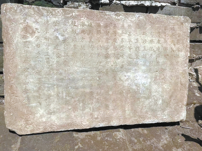“發(fā)現(xiàn)一塊石碑,出土?xí)r碑文一面向下,推測(cè)這塊石碑原來(lái)鑲嵌在北側(cè)垛口墻內(nèi)側(cè),墻體傾斜倒塌后,石碑脫落。”項(xiàng)目考古負(fù)責(zé)人、北京考古研究院副研究員尚珩介紹。石碑為青石材質(zhì),保存完整,邊框刻著纏枝卷草紋。因?yàn)槊撀鋾r(shí)碑文面朝下,因此碑文保存完好,字體為繁體字,字跡娟秀,清晰可辨。
