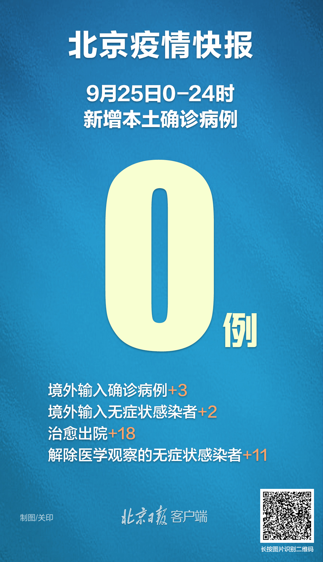 9月25日0時至24時,北京無新增本土確診病例、疑似病例和無癥狀感染者;新增3例境外輸入確診病例和2例無癥狀感染者,無新增疑似病例。治愈出院18例,解除醫(yī)學觀察的無癥狀感染者11例。