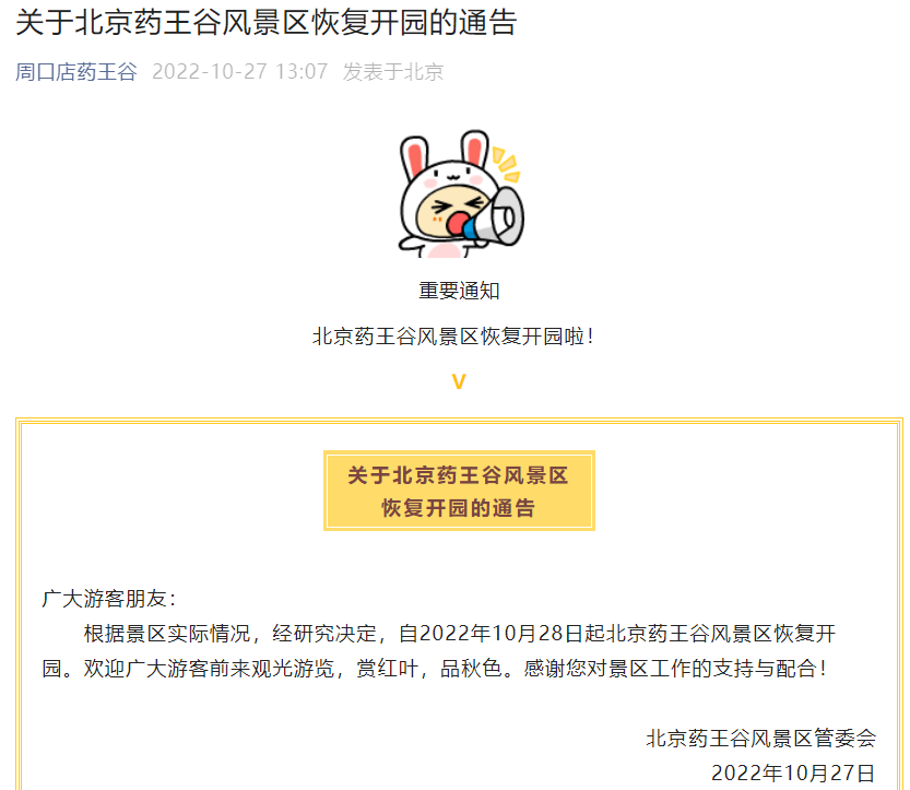 北京藥王谷風(fēng)景區(qū)將于10月28日恢復(fù)開(kāi)園