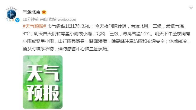北京市氣象臺(tái)1日17時(shí)發(fā)布:今天(1日)夜間晴轉(zhuǎn)陰,南轉(zhuǎn)北風(fēng)一二級,最低氣溫4℃;明天白天陰轉(zhuǎn)零星小雨或小雨,北風(fēng)二三級,最高氣溫14℃。