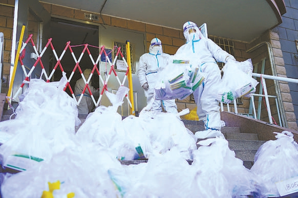 近日,朝陽(yáng)區(qū)東湖街道利澤西園一區(qū)社區(qū)“大白”逐戶(hù)為封控居民送抗原試劑盒,分發(fā)蔬菜包等生活必需品。 本報(bào)記者 程功攝