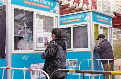 11月23日,朝陽區(qū)鴻博家園第四社區(qū),居民掃碼登記進(jìn)行核酸檢測。 新京報記者 王飛 攝