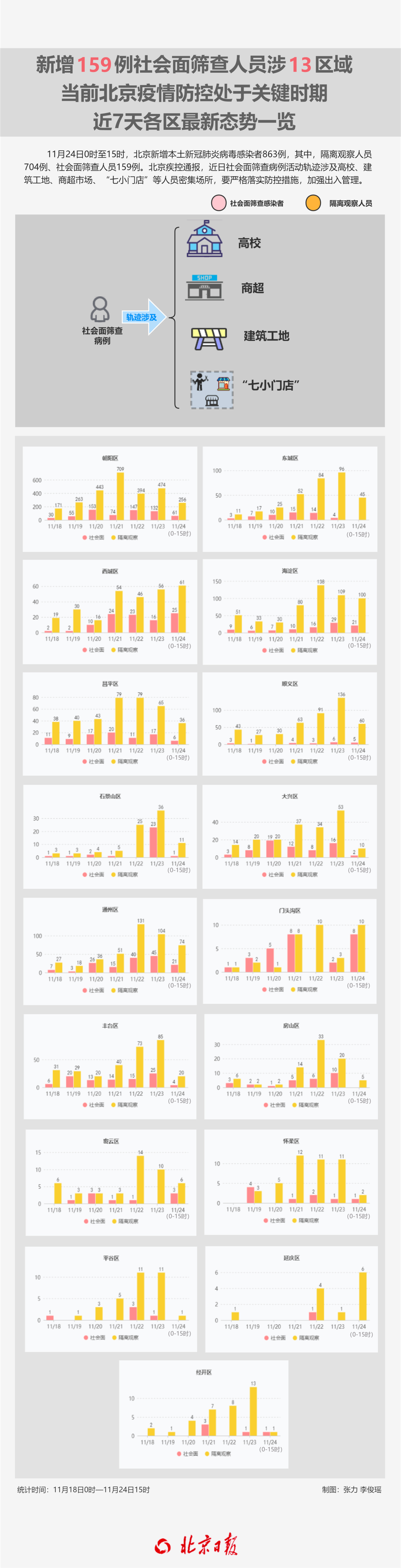 11月24日0時(shí)至15時(shí),北京新增本土新冠肺炎病毒感染者863例,其中,隔離觀察人員704例、社會(huì)面篩查人員159例;朝陽(yáng)區(qū)317例,海淀區(qū)121例,通州區(qū)95例,西城區(qū)86例,順義區(qū)65例,東城區(qū)45例,昌平區(qū)42例,豐臺(tái)區(qū)24例,門頭溝區(qū)18例,石景山區(qū)、大興區(qū)各12例,密云區(qū)9例,延慶區(qū)6例,房山區(qū)5例,懷柔區(qū)3例,經(jīng)開(kāi)區(qū)2例,平谷區(qū)1例;重型3例、普通型2例、輕型164例、無(wú)癥狀感染者694例。