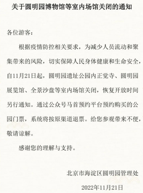 近日,北京市海淀區(qū)圓明園管理處發(fā)布關(guān)閉室內(nèi)場館的通知,自11月21日起,圓明園遺址公園內(nèi)正覺寺、圓明園展覽館、全景沙盤等室內(nèi)場館關(guān)閉,恢復(fù)開放時(shí)間另行通知。