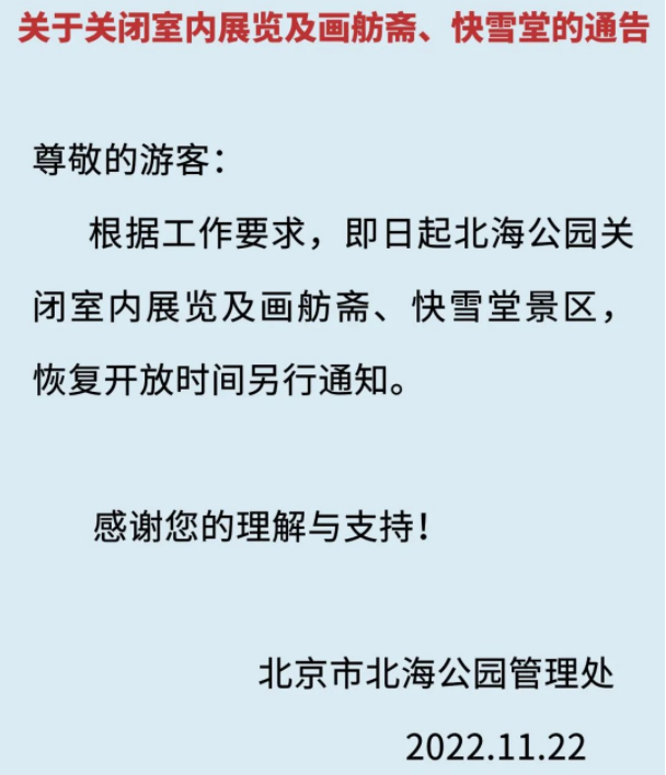 北京市北海公園管理處發(fā)布公告稱,根據(jù)工作要求,自11月22日起,北海公園關(guān)閉室內(nèi)展覽及畫舫齋、快雪堂景區(qū),恢復(fù)開放時(shí)間另行通知。
