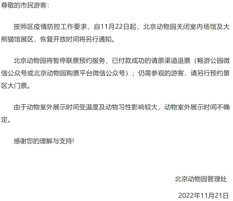北京動(dòng)物園管理處發(fā)布通知,按照西城區(qū)疫情防控工作要求,自11月22日起,北京動(dòng)物園關(guān)閉室內(nèi)場館及大熊貓館展區(qū),恢復(fù)開放時(shí)間另行通知。