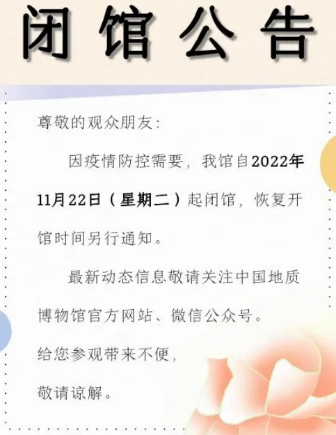 中國地質(zhì)博物館發(fā)布公告稱,因疫情防控需要,中國地質(zhì)博物館自11月22日起閉館,恢復(fù)開館時(shí)間另行通知。