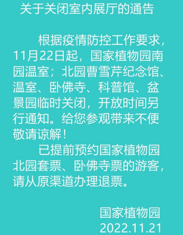 據(jù)國家植物園消息,根據(jù)疫情防控工作要求,11月22日起,國家植物園南園溫室,北園曹雪芹紀(jì)念館、溫室、臥佛寺、科普館、盆景園臨時(shí)關(guān)閉,開放時(shí)間另行通知。