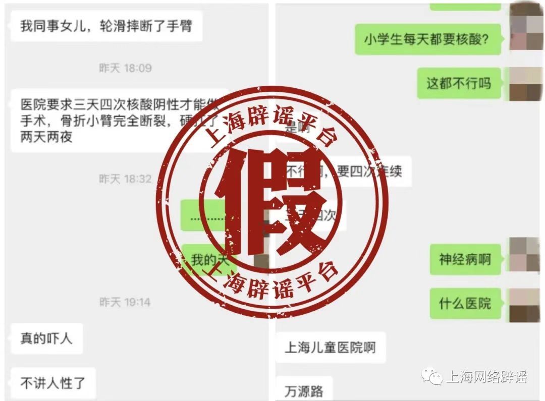 “上海一醫(yī)院要求兒童三天四次核酸才能做手術(shù),孩子骨折小臂斷裂,硬抗了兩天兩夜。”不久前,一條聊天記錄在陸先生的家屬群引發(fā)熱議。因?yàn)楸斫阋患疑钤谏虾?,親戚還特意提醒她照顧好孩子。而很快,官方發(fā)布辟謠消息,稱經(jīng)過多路求證,聊天記錄中所指醫(yī)院并沒有三天四次核酸檢測(cè)陰性才能手術(shù)的要求,院方也未核查到存在所傳相似情況的病人。