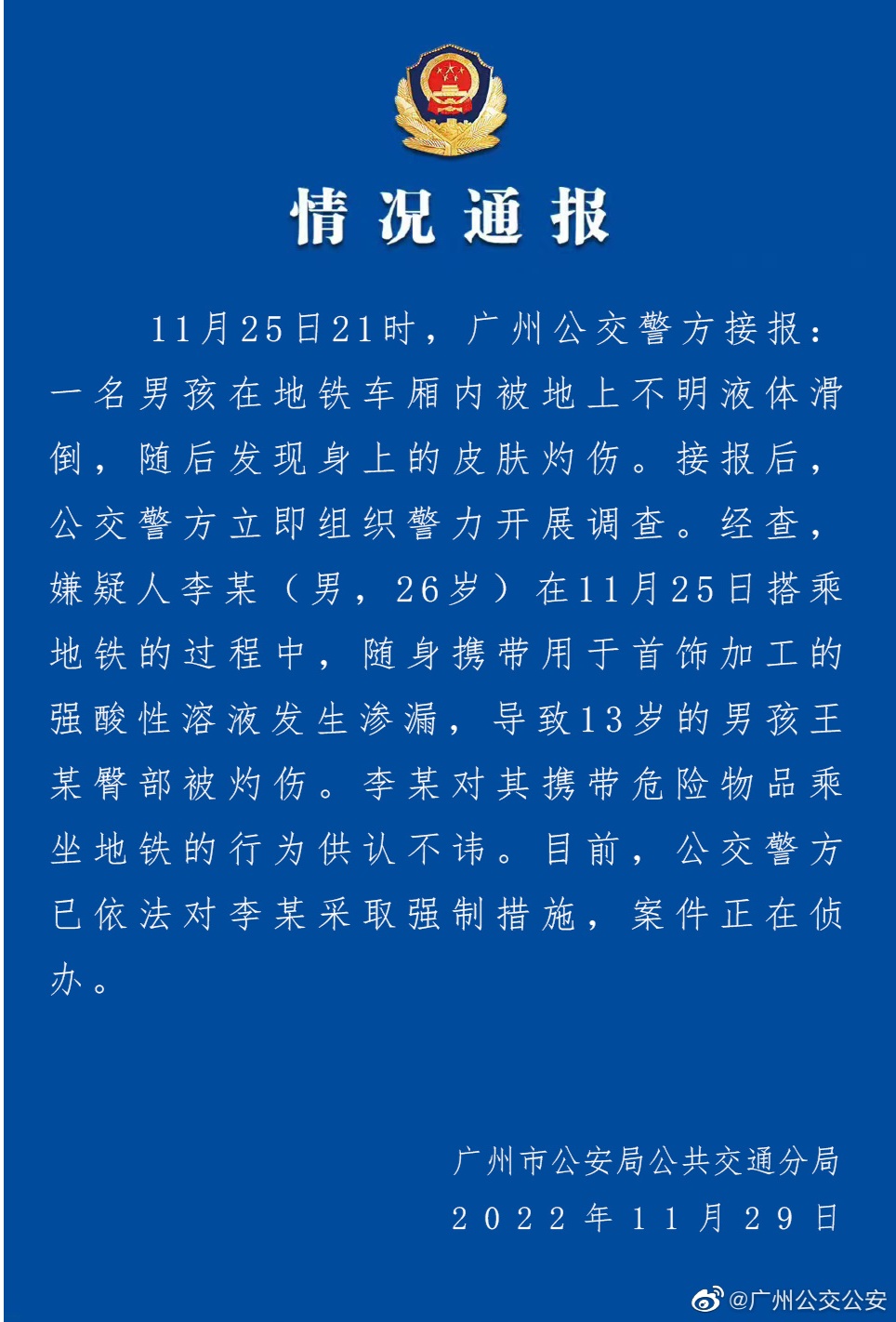 通報(bào)顯示,25日21時(shí),廣州公交警方接報(bào)稱,一名男孩在地鐵車廂內(nèi)被地上不明液體滑倒,隨后發(fā)現(xiàn)身上的皮膚灼傷。接報(bào)后,公交警方立即組織警力開展調(diào)查。經(jīng)查,嫌疑人李某(男,26歲)在11月25日搭乘地鐵的過程中,隨身攜帶用于首飾加工的強(qiáng)酸性溶液發(fā)生滲漏,導(dǎo)致13歲的男孩王某臀部被灼傷。李某對(duì)其攜帶危險(xiǎn)物品乘坐地鐵的行為供認(rèn)不諱。