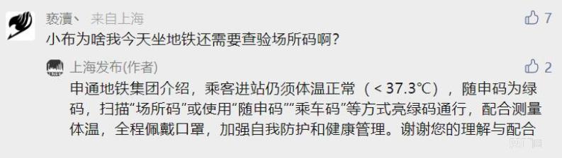 “上海發(fā)布”微信公眾號回復(fù)稱,乘客進(jìn)站仍須體溫正常(<37.3℃),隨申碼為綠碼,掃描“場所碼”或使用“隨申碼”“乘車碼”等方式亮綠碼通行,配合測量體溫,全程佩戴口罩,加強(qiáng)自我防護(hù)和健康管理。