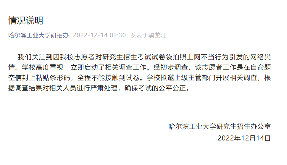 央廣網(wǎng)哈爾濱12月14日消息(記者馬俊瑋)12月14日,哈爾濱工業(yè)大學(xué)研究生招生辦公室通報(bào):我們關(guān)注到因我校志愿者對(duì)研究生招生考試試卷袋拍照上網(wǎng)不當(dāng)行為引發(fā)的網(wǎng)絡(luò)輿情。學(xué)校高度重視,立即啟動(dòng)了相關(guān)調(diào)查工作。經(jīng)初步調(diào)查,該志愿者工作是在自命題空信封上粘貼條形碼,全程不能接觸到試卷。學(xué)校擬邀上級(jí)主管部門(mén)開(kāi)展相關(guān)調(diào)查,根據(jù)調(diào)查結(jié)果對(duì)相關(guān)人員進(jìn)行嚴(yán)肅處理,確??荚嚨墓焦?。