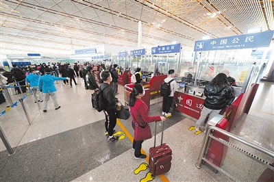 北京邊檢總站執(zhí)勤二大隊(duì)執(zhí)勤三隊(duì)隊(duì)長(zhǎng)張衛(wèi)濤介紹,為確保航班恢復(fù)后給旅客提供更好的通關(guān)體驗(yàn),北京邊檢總站在T3-E邊檢入境現(xiàn)場(chǎng)增加了12條查驗(yàn)通道和一個(gè)候檢區(qū)域,并設(shè)有特別通道,為老幼病殘?jiān)械忍厥饴每吞峁┩P(guān)便利,其他通道區(qū)分中國(guó)公民和外國(guó)人通道,現(xiàn)場(chǎng)旅客可隨工作人員引導(dǎo),進(jìn)入相應(yīng)通道排隊(duì)候檢。“北京邊檢總站加強(qiáng)與機(jī)場(chǎng)相關(guān)單位流程對(duì)接,優(yōu)化流程通路,確保勤務(wù)轉(zhuǎn)場(chǎng)順利有序?!北本┻厵z總站執(zhí)勤二大隊(duì)副隊(duì)長(zhǎng)徐春靜說(shuō)。