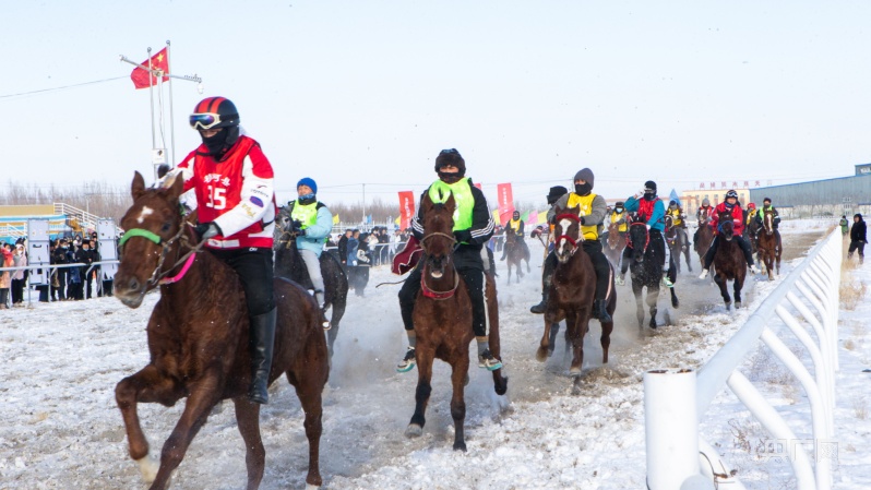 “馬匹就位,預(yù)備……”隨著裁判一聲令下,騎手們駕馭的賽馬如離弦之箭,爭先恐后奔騰而過,雪地上馬蹄聲聲、雪花飛揚。參賽選手揮舞韁繩,策馬揚鞭,像一陣疾風(fēng)掠過,盡情地在賽道上體驗著激情與速度。緊張刺激的比賽贏得觀眾的一片歡呼,大家紛紛拿出手機拍照,用鏡頭記錄下精彩的瞬間,現(xiàn)場歡呼聲、助威聲不絕于耳,把比賽氣氛推向了高潮。
