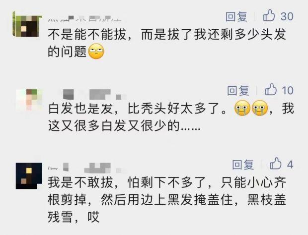 一些人在壓力較大時(shí),可能會(huì)將疼痛感轉(zhuǎn)化為某種獲得感,在一定程度上緩解焦慮。但更多人是從拔白頭發(fā)這件事當(dāng)中獲得一種視覺(jué)上的自信——似乎又回到了頭發(fā)烏黑的時(shí)代。