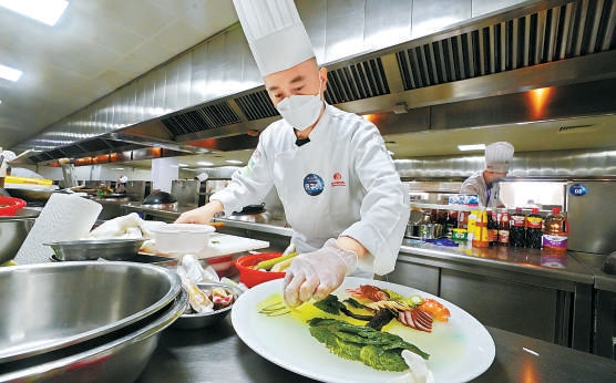 比賽開始后,首先進(jìn)行藝術(shù)冷拼制作環(huán)節(jié),規(guī)定用時1小時;隨后進(jìn)行其余熱菜,用時兩小時?!斑@主要是考慮到比賽的公正性,每位選手在同一時間段制作完成相同的菜品,評委統(tǒng)一品嘗、打分,避免同一菜品因出菜時間不同導(dǎo)致評委打分忽高忽低?!钡谌龑谩氨本┐蠊そ场敝惺脚胝{(diào)師比賽裁判長侯玉瑞告訴記者,3小時制作完成4道菜品對選手來說難度不小,“平時廚師操作是有分工的,但比賽現(xiàn)場所有工序都要選手一個人完成,而且比賽時間也很緊張。通常制作一道冷拼的時間是90分鐘,這次比賽不僅操作時間短,還要求至少使用4葷3素7種食材,對食材的選料、用料,色彩搭配以及刀工要求都非常高?!焙钣袢鹫f,冷拼刀工要求食材既要切得薄,外表還要平整、不毛糙,整體擺盤要有創(chuàng)意。