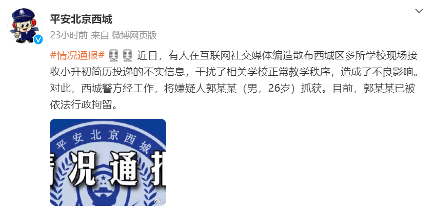 北京西城警方辟謠“多校現(xiàn)場接收小升初簡歷”