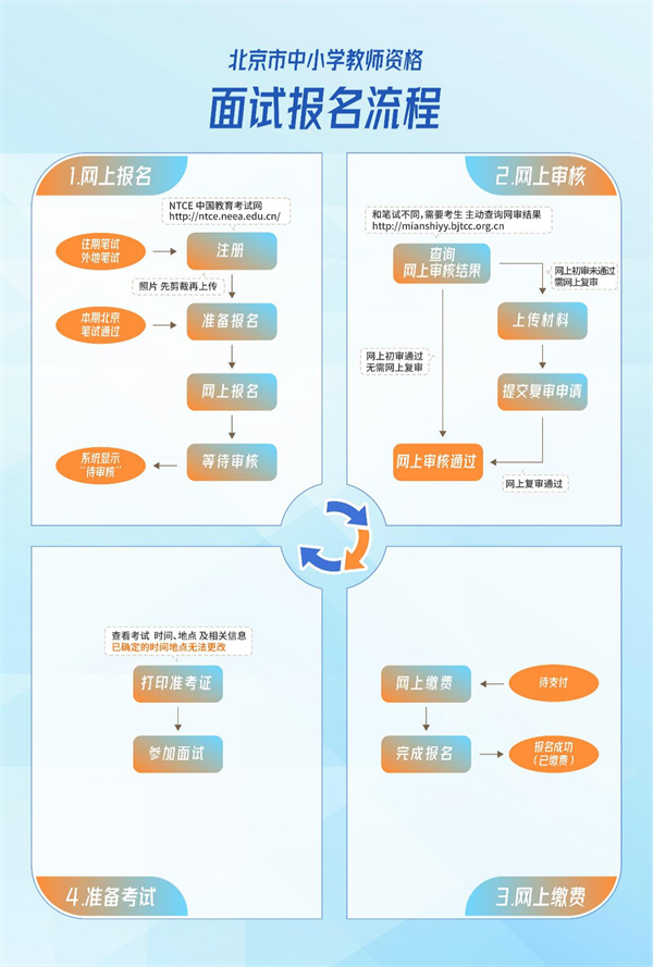 報(bào)考面試流程為:網(wǎng)上報(bào)名→網(wǎng)上審核→網(wǎng)上繳費(fèi)→查詢準(zhǔn)考證→參加面試→查詢成績(jī)。