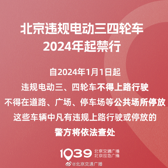 2022年,北京市共發(fā)生違規(guī)電動三、四輪車交通事故131起,死亡138人。市交管局于4月12日再次強調(diào),自2024年1月1日起,違規(guī)電動三、四輪車不得上路行駛,不得在道路、廣場、停車場等公共場所停放。這些車輛中凡有違規(guī)上路行駛或停放的,警方將依法查處。