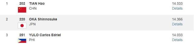 男子單杠項(xiàng)目,田昊以14.533分奪得冠軍。另一名中國選手蘇煒德以11.866分排名第七。