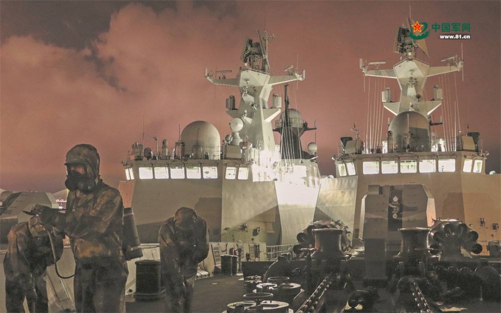夜幕下,海軍某支隊官兵正在進行洗消作業(yè)。王春光 攝