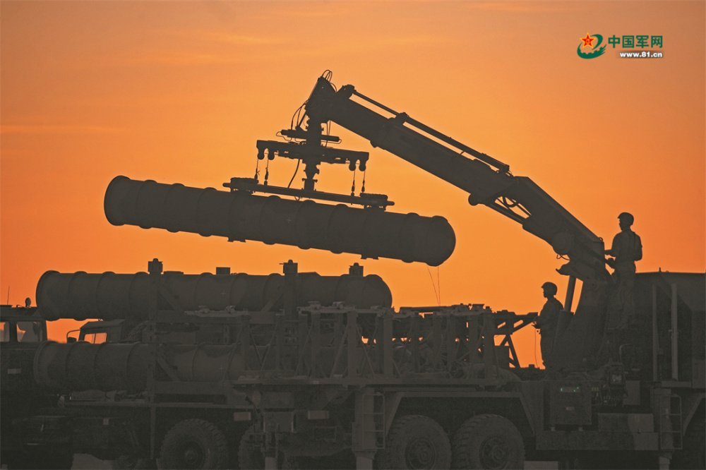 空軍地導某旅官兵快速吊裝導彈,開展夜間空地對抗演練。向坤 攝