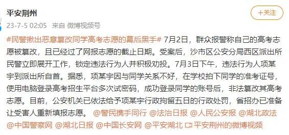 7月2日,湖北荊州,一女生報(bào)警稱自己的高考志愿被篡改,且已經(jīng)過(guò)了網(wǎng)報(bào)志愿的截止日期。受案后,沙市區(qū)公安分局西區(qū)派出所民警立即展開(kāi)工作,鎖定違法行為人并積極勸投。