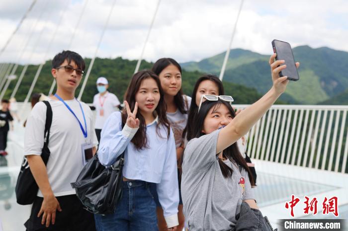 7月3日至8日,2023年全國(guó)臺(tái)聯(lián)第二十屆臺(tái)胞青年千人夏令營(yíng)湖南分營(yíng)舉行。圖為臺(tái)胞青年“打卡”張家界玻璃橋?!∴嵑蜐?攝