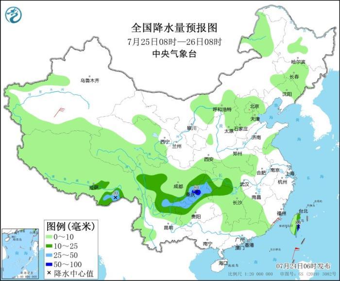 7月25日08時至26日08時,四川西部和南部、重慶大部、湖北西南部、湖南西北部、貴州北部、云南東北部、西藏東南部、臺灣島東部等地的部分地區(qū)有中到大雨,局地有暴雨(50~80毫米)(見圖3)。新疆南疆盆地、浙江東部等地的部分地區(qū)有4~6級風(fēng)。