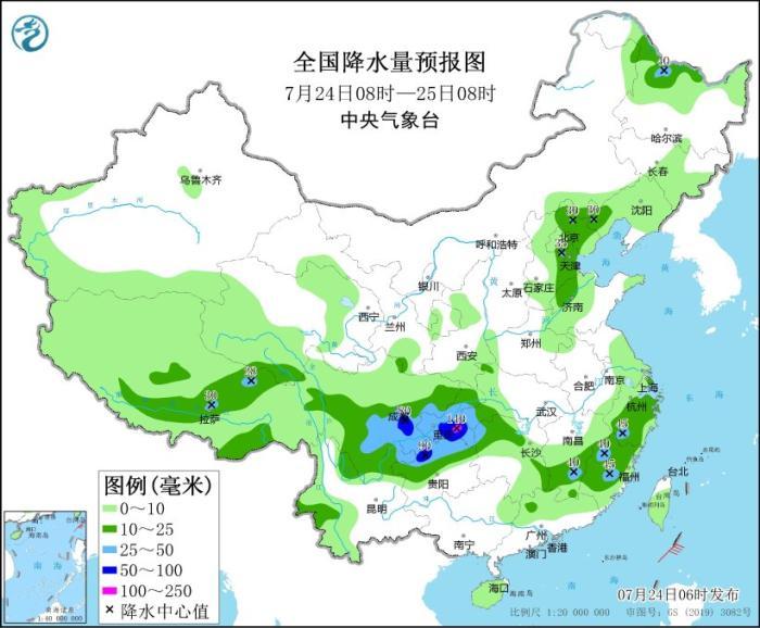 圖2 全國降水量預(yù)報圖(7月24日08時-25日08時)